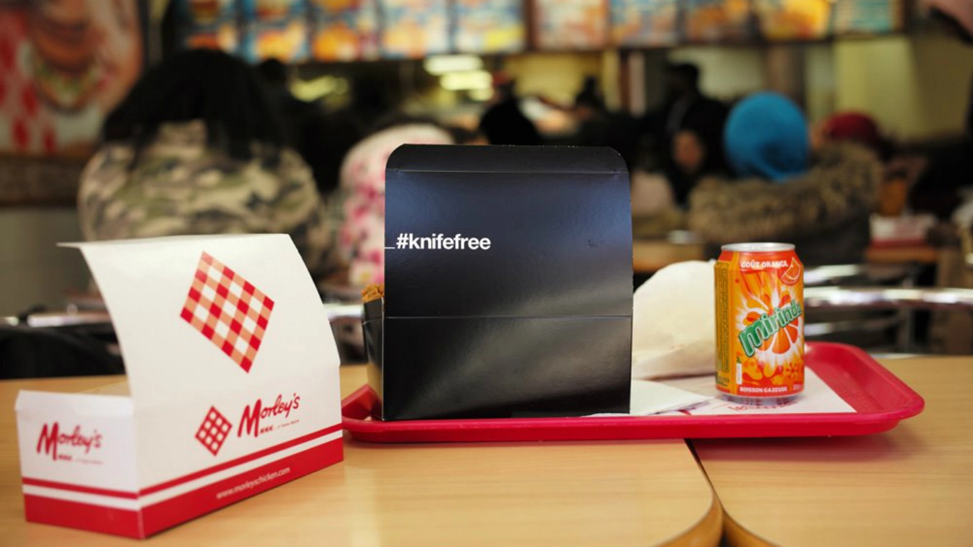 Thousands of chicken boxes at takeaways in London, Manchester and Birmingham bear the slogan “#knifefree”. On the inside of the lids there are printed real-life accounts of young people who chose activities like boxing and music over carrying a blade.