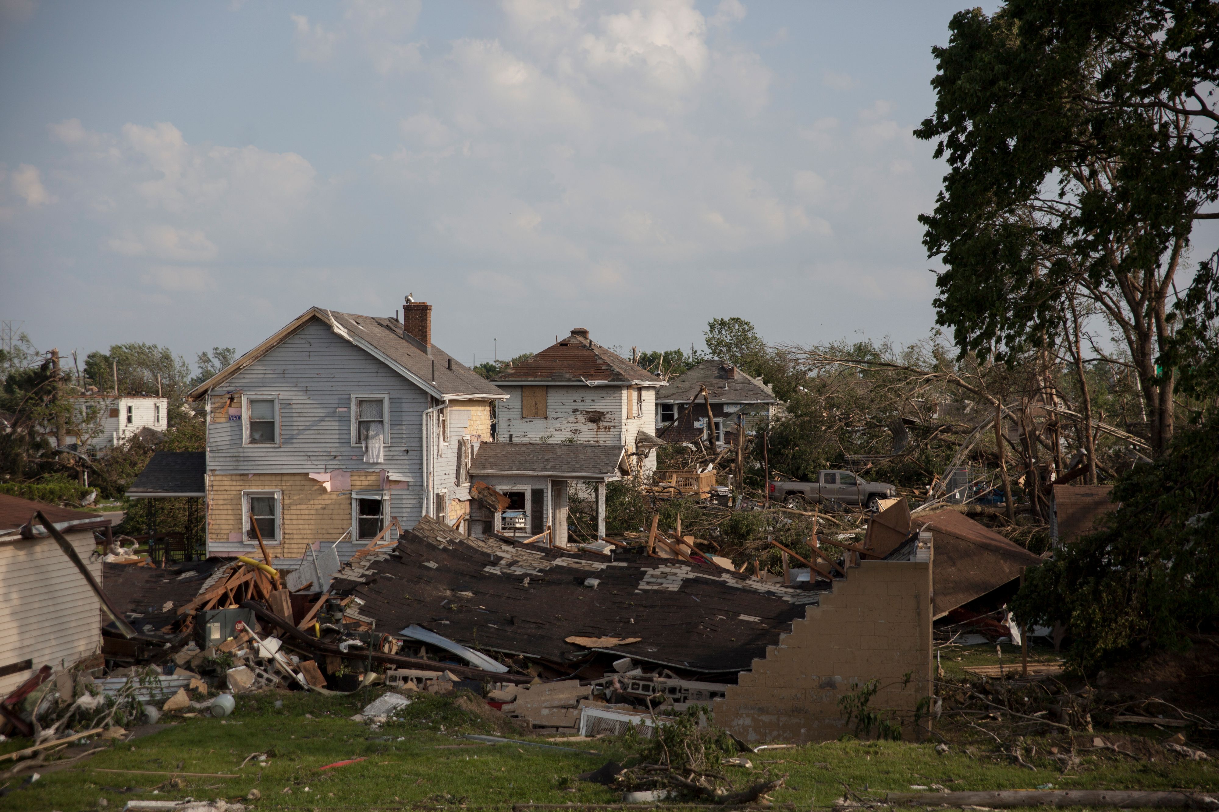 A 12-day barrage of tornadoes and other violent weather continued in parts of the Midwest and Plains late Tuesday as tornadoes tore through eastern Kansas and Missouri. The latest twisters ripped up trees and power lines, and destroyed several houses in and near Lawrence, Kansas, southwest of Kansas City. Twelve people were injured. The previous day's storms, which hit eight states with 55 tornadoes, killed one person and injured at least 130 others in Ohio and Indiana. The mayor of Celina, Ohio, announced on Tuesday that 82-year-old Melvin Dale Hanna was killed when a parked car slammed into his house, and said there are areas of his town "that truly look like a war zone."