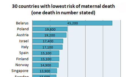 Women in Britain face a one in 6,900 risk of maternal death over their lifetime, meaning they are more than six times as likely to die as women in Belarus, which had the lowest maternal death rate of one in 45,200.