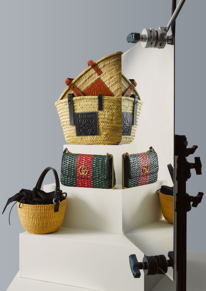From Ibiza to Florence and Dover Street, London: Loewe handwoven Basket Bags with tan or black calfskin details, £295, loewe.com; Gucci green and red Web small shoulder bag with gold-tone chain strap and double G emblem, £1,690, gucci.com; Muun handwoven Egg Knit Straw Tote with black cotton pouch, £140, doverstreetmarket.com