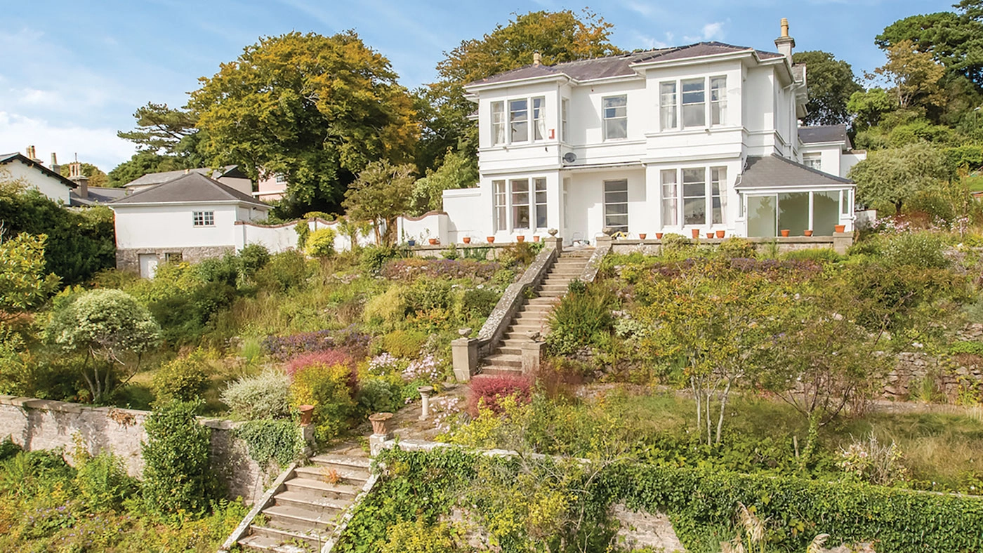 Summerhill, Torquay, Devon. A Victorian villa in an elevated position with views of Tor Bay and the English Channel. It has a traditional staircase that rises to a half landing with stained-glass windows, and walled gardens with wrought-iron entrance gates and a central flight of steps descending through the terraced grounds. 4 beds, 3 baths, 3 receps, conservatory. £1.18m John Couch 01803-296500.