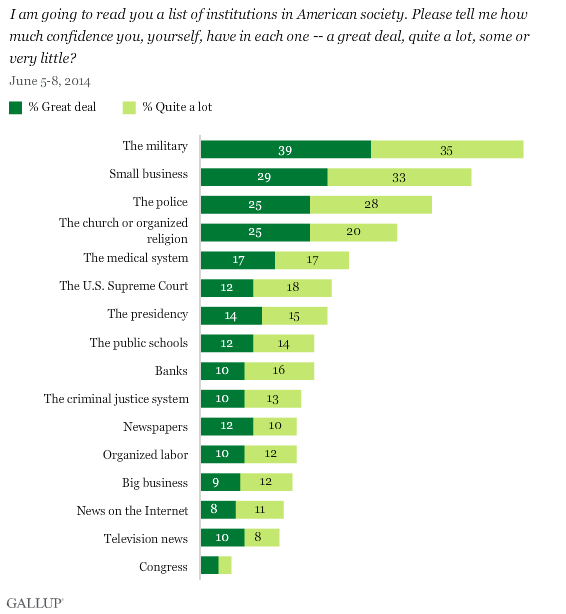 Only three institutions top 50 percent — the military, small businesses, and the police. The military's numbers have been generally rising since the end of the Vietnam War, if you look at Gallup's historical numbers, but most of the institutions are more in line with organized religion:
