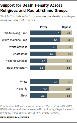 A Pew poll from March found a smaller majority, 55 percent, in favor of the death penalty. Gallup broke out its poll numbers by political party — in the latest poll, 81 percent of Republicans, 60 percent of independents, and 47 percent of Democrats supported capital punishment — but Pew broke it down by religion: