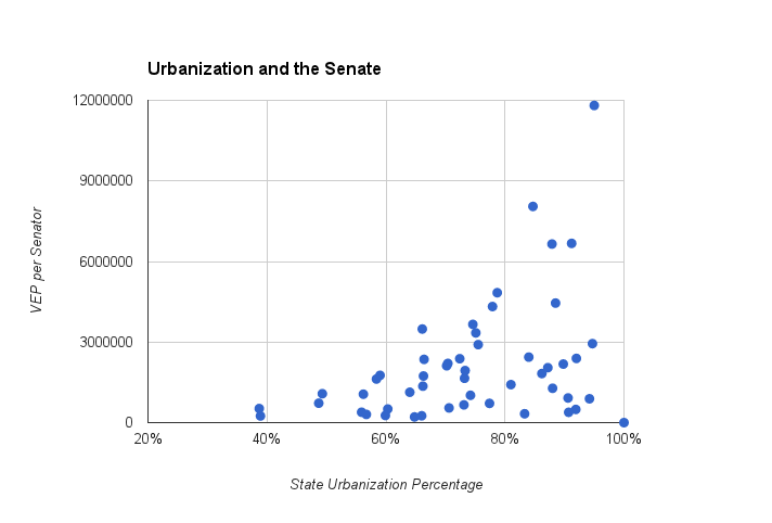 There we have it: as urbanization increases, the number of voters represented per senator increases dramatically. This is the bulwark of rural strength — and what an enormous source of strength it is. The Electoral College over-represents small states, but the effect is limited by the House (a state's electoral votes equals its House seats plus two). The Senate, by contrast, has no such mechanism: California and Wyoming both get two senators, even though the former is nearly 66 times larger population-wise.