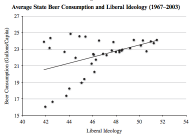The study by Pavel Yakovlev and Walter P. Guessford of Duquesne University in Pennsylvania shows a direct correlation between political beliefs and the demand for alcohol. The study compares sales of alcoholic beverages against the political leanings of a state's members of Congress, as ranked by liberal organizations Americans for Democratic Action (ADA) and the AFL-CIO Committee on Political Education (COPE).