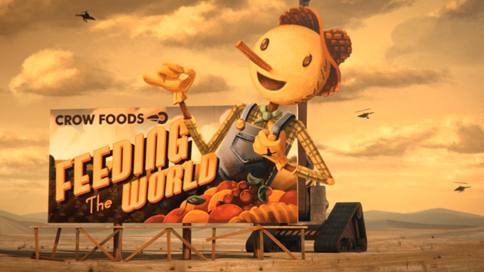 LINDBERG: There was a time where there was a bad guy. There were these masked scientists that were working behind the scenes — you never saw their faces and they were controlling the machinery, and it just seemed too complex to have another sort of character in our world. We've got the citizens — the consumers — you've got the crows, and you've got the scarecrows. It was like a lightning bolt for us when we were looking at scarecrows and it was like, "Scarecrows, why don't we make them the farmer?" Make them the definition of what the farm is and this idea of farms, and sort of imbue that all onto the scarecrow.