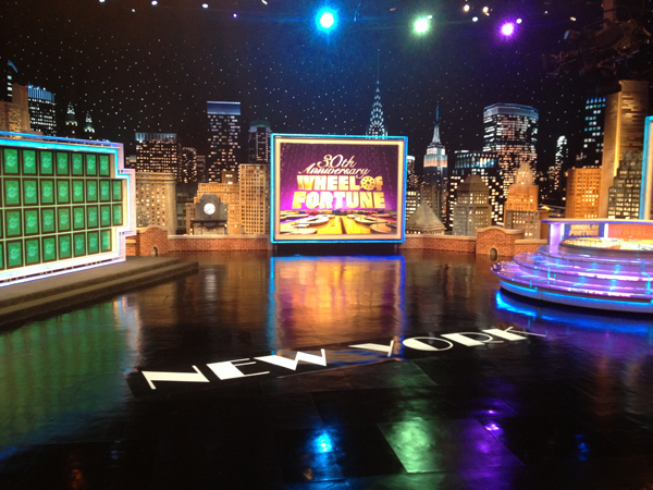And it requires 14 giant trucks to move it. There are 12 high definition cameras, 140 color monitors, and more than 30 miles of cables. "We try as best we can make the viewer feel like we are plunked down in the middle of wherever it is we're going," says Harry Friedman, the show's executive producer. The wheel and puzzleboard are one of a kind, so they are dismantled and reassembled whenever the show travels. Here's the New York City set: