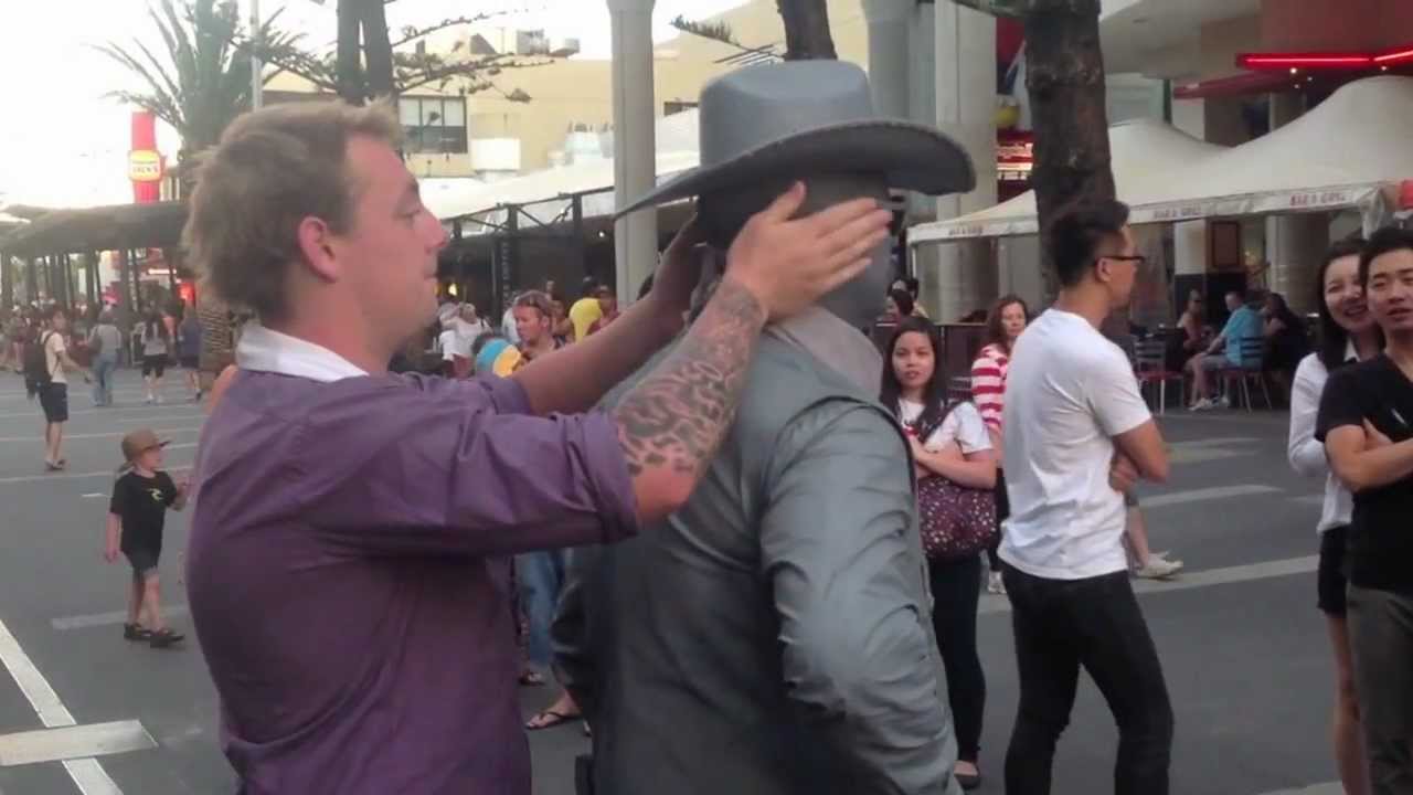 This week in catharsis: A street performer gently lets an annoying heckler know there's a human under there, all without saying a word. (Via Laughing Squid)