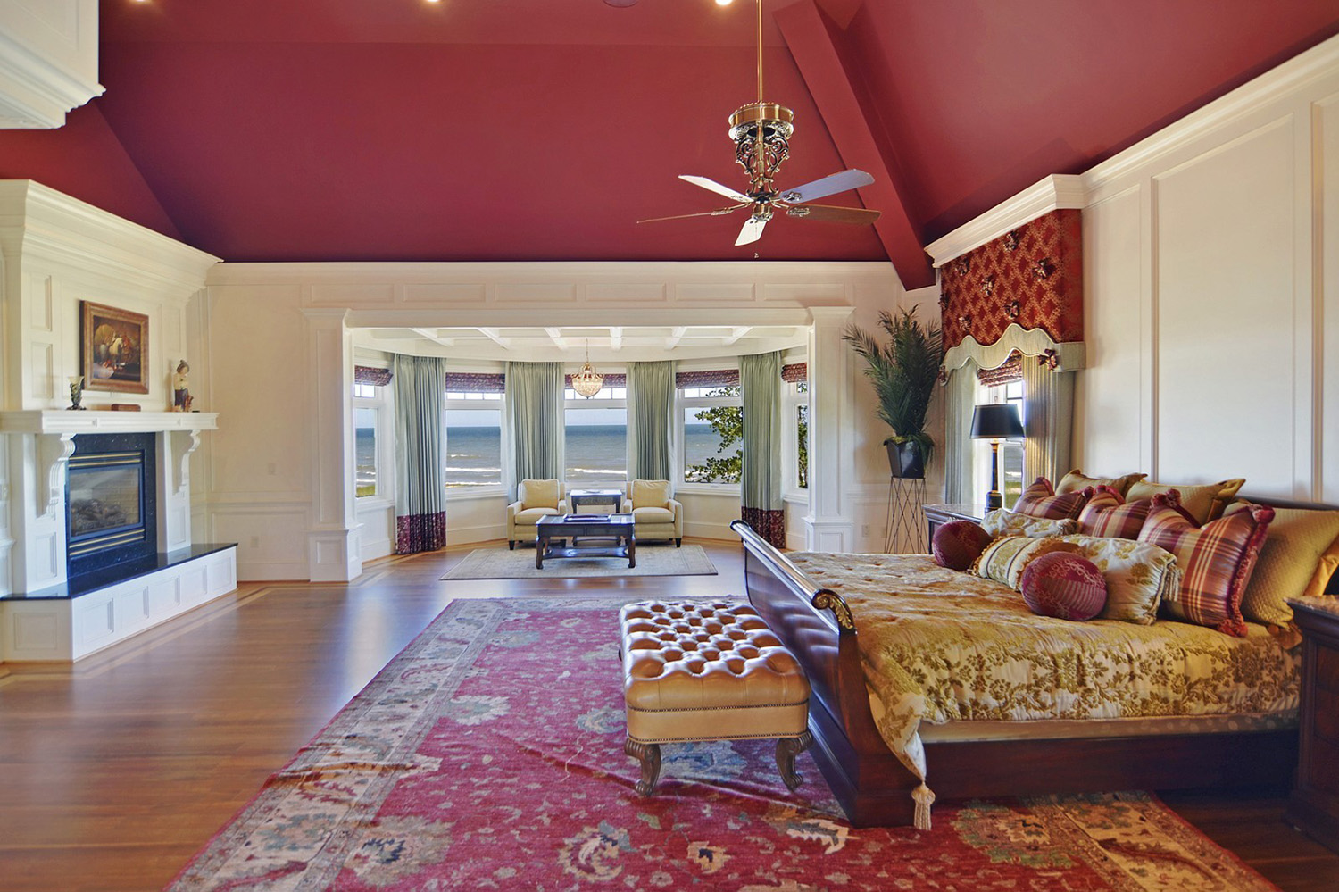 South Haven, Michigan. This five-bedroom home sits on 3 acres along the shores of Lake Michigan. The great room has a cathedral ceiling, a large stone fireplace, and a wall of windows looking onto the water.