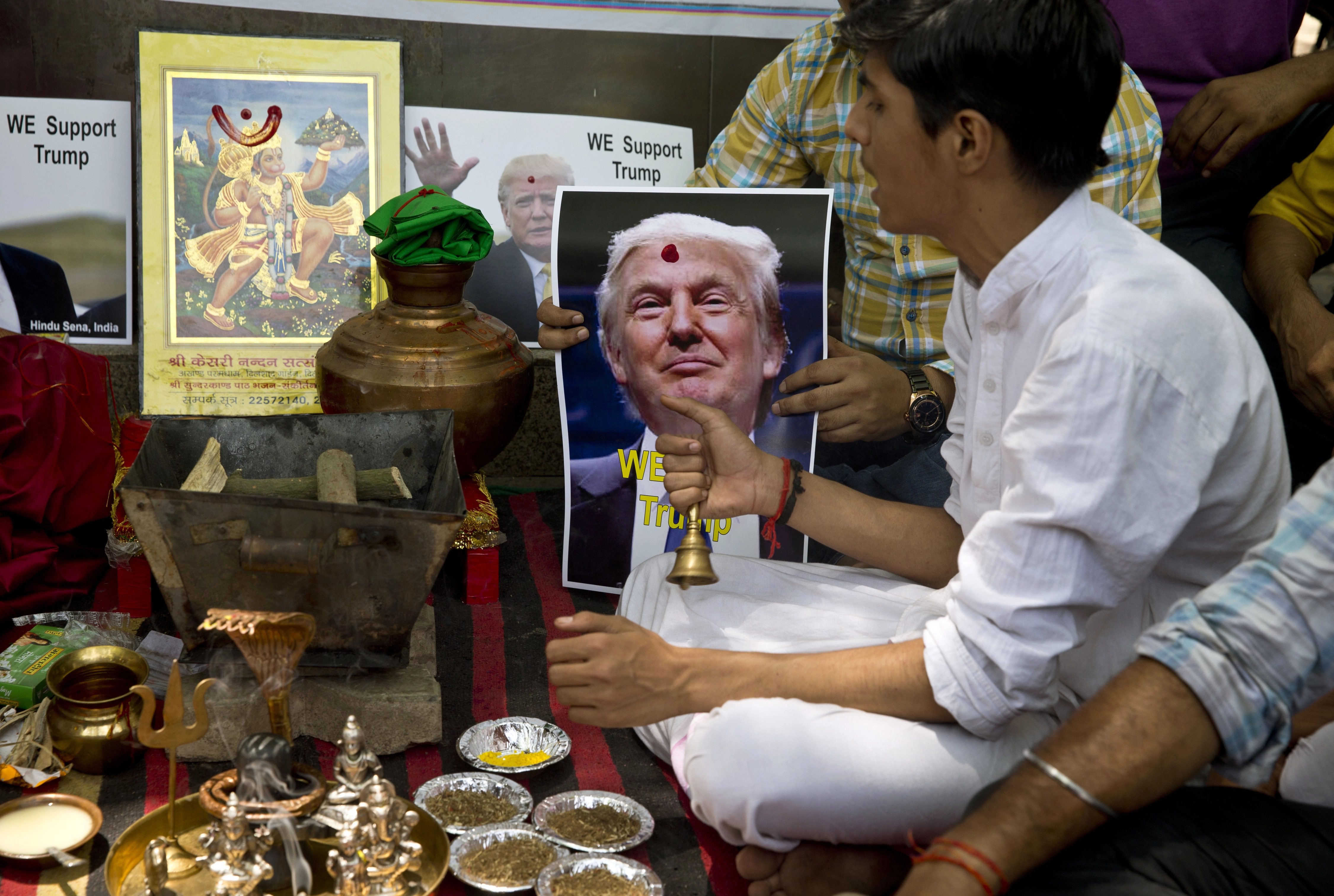 To Donald Trump, Hindu Sena probably means nothing. Is it a new casino in Atlantic City? Actually, it is a Hindu nationalist group in India that recently held a havan — a public prayer — in the heart of New Delhi for Trump's victory in November. Sena members smudged vermilion on the forehead of his posters, lit candles, and chanted Sanskrit shlokas — verses — from Hindu scriptures imploring Gods Shiva and Hanuman to bless his campaign.