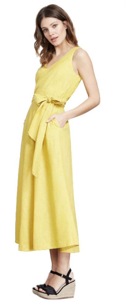Grab attention while staying loose with this sleeveless cotton-linen midi in mimosa yellow. The flattering waist tie sits just above two generous front pockets. Also available in snapdragon red. Buy it at Endource.