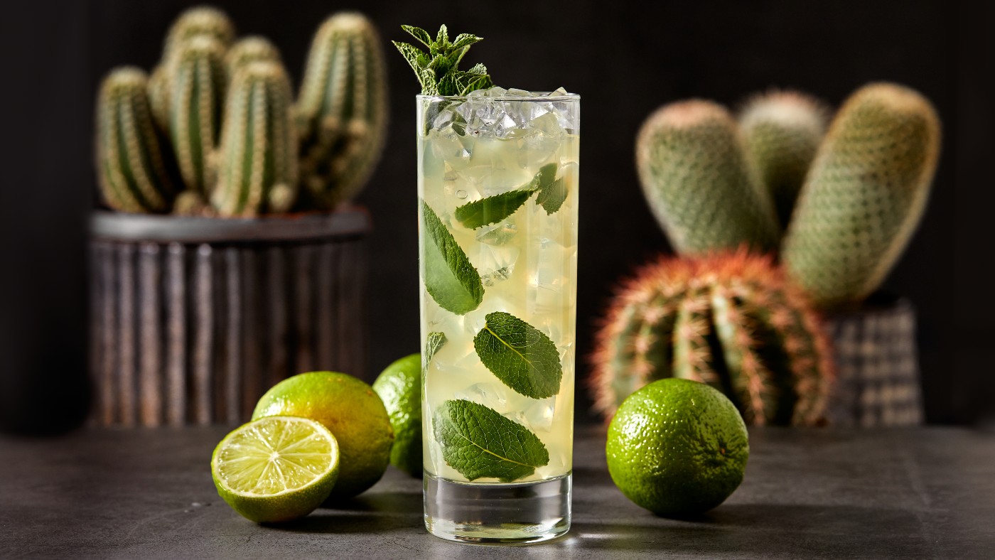 Fill a glass with cubed ice and add all the ingredients. Gently stir then garnish with a fresh sprig of mint.
