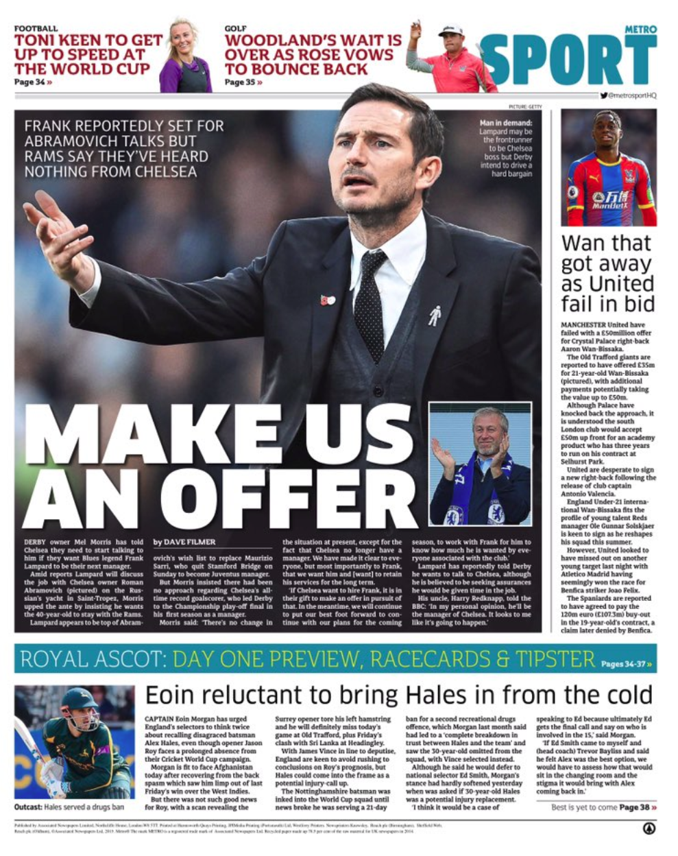 Despite claims that Lampard will replace Maurizio Sarri the Metro reports that Derby County are yet to hear from Chelsea about a move for their manager.