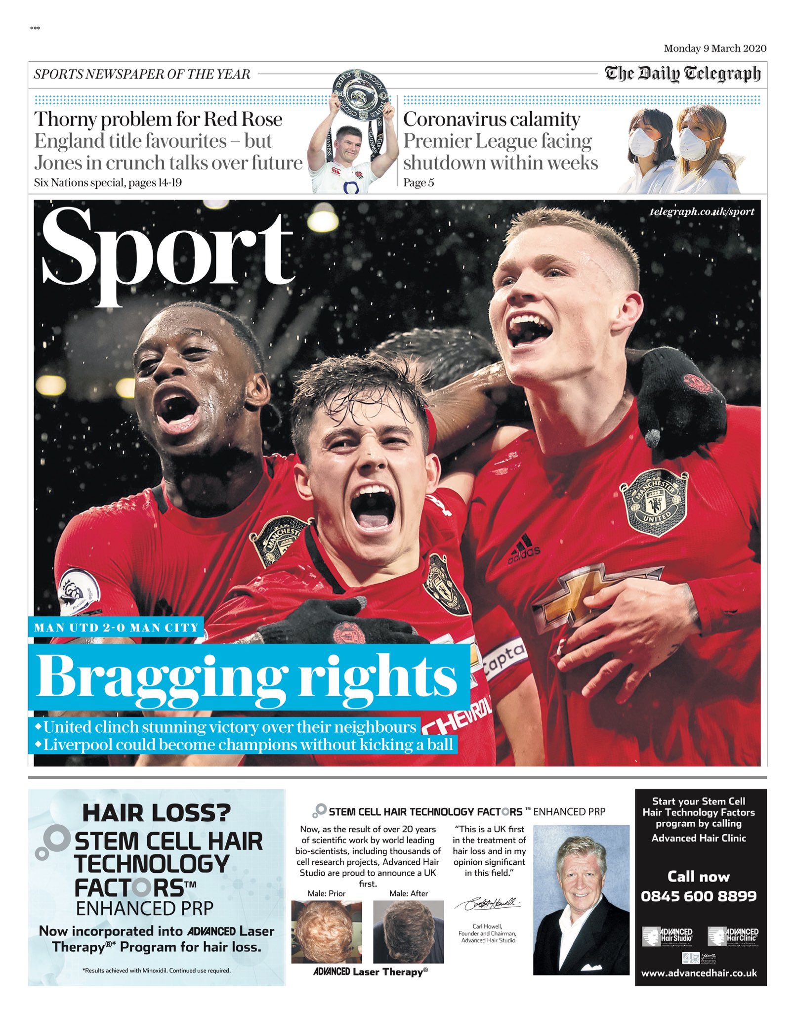 Scotland’s dramatic 28-17 victory over France at Murrayfield makes most of the back pages with the result meaning that four teams are still in with a shout of winning the Six Nations tournament. England, who beat Wales 33-30 on Saturday, top the table but their final match in Rome next week has been postponed because of the coronavirus outbreak in Italy. So they’ll have to sit and watch what happens when Scotland play Wales and France host Ireland, although that match might also fall victim to coronavirus as cases continue to rise in France. Ireland didn’t play at the weekend because their game with Italy was shelved and they, along with Scotland, are also in contention for a title that is unlikely to be decided before the autumn.