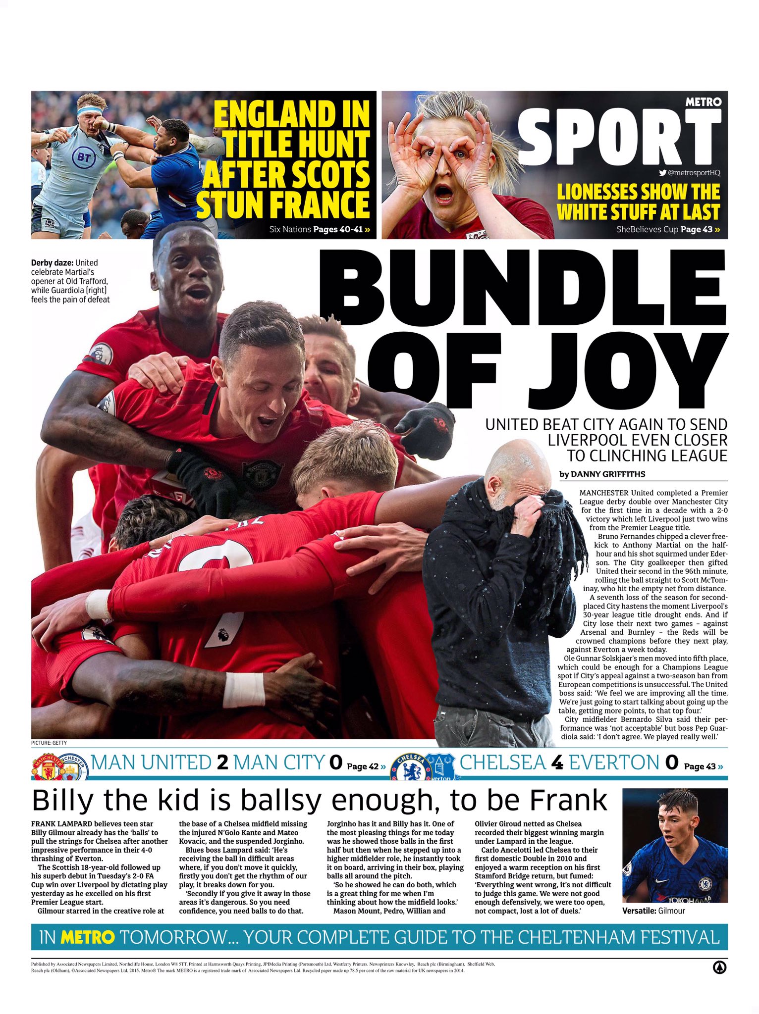 Manchester United’s 2-0 win against Man City in their derby encounter dominates the tabloids. “Bundle of Joy” is Metro’s headline, above a photograph of celebrating United players, while the Daily Mirror goes for “Red Hot”. The paper claims that United’s win, which moves them into fifth in the table, just three points shy of fourth place Chelsea, is further evidence that the Red Devils are rediscovering their mojo under Ole Gunnar Solskjaer.