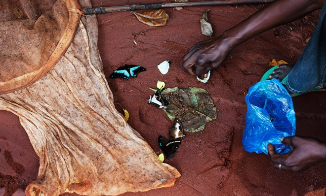 In a forest outside of Bangui, Central African Republic, men make their living hunting tiny, delicate creatures. With trained eyes, they spot the butterflies, swoop in with huge nets, and capture the dancing insects in a way that preserves each specimen's unique beauty. The day's catch is then sold to artists.