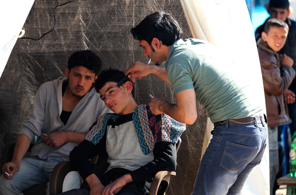 March 25, 2013: Friends cut a young man's hair at Bab Al-Salam camp near the Syria-Turkey border. | (REUTERS/Giath Taha)