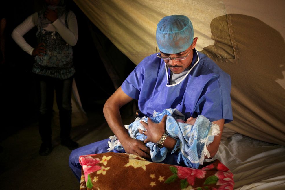 May 6, 2013: An obstetrician holds a baby after delivery at a field hospital in Zaatari refugee camp near the Syrian border in Mafraq, Jordan. | (AP Photo/Mohammad Hannon)