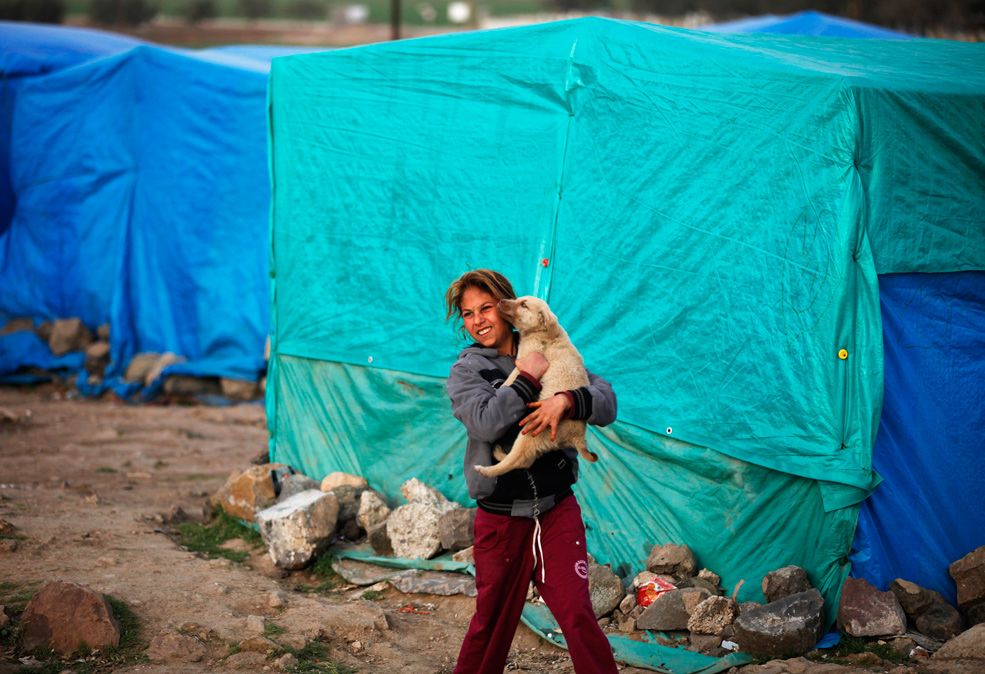 March 2, 2014: A girl gets a snuggle and a smooch from a puppy at Kilis refugee camp in Kilis, Turkey. | (REUTERS/Nour Kelze)