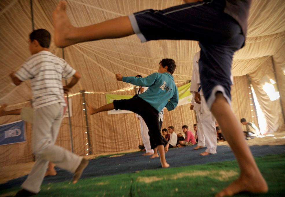 Sept. 17, 2013: Children participate in taekwondo training at Zaatari refugee camp near Mafraq, Jordan. | (AP Photo/Bela Szandelszky)