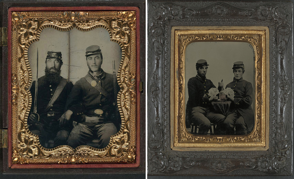 Below, is a selection of soldier and family portraits, still in their ornate, keepsake frames. For many of the men, these tiny, palm-sized ambrotypes might have been their first and last representation. The set-ups were meant to capture what the men held dear as they went off to battle — whether a lock of a loved-ones hair or a photo of the comrades by their side.