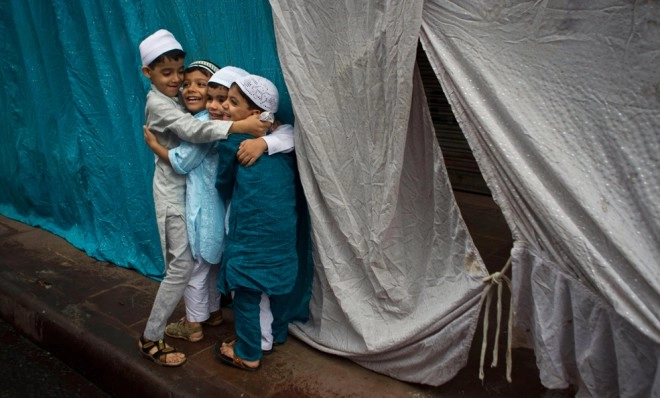 Muslim children hug after offering Eid prayers in New Delhi. Eid al-Fitr marks the end of the holy month of Ramadan, during which Muslims all over the world fast from sunrise to sunset. (AP Photo/Tsering Topgyal)