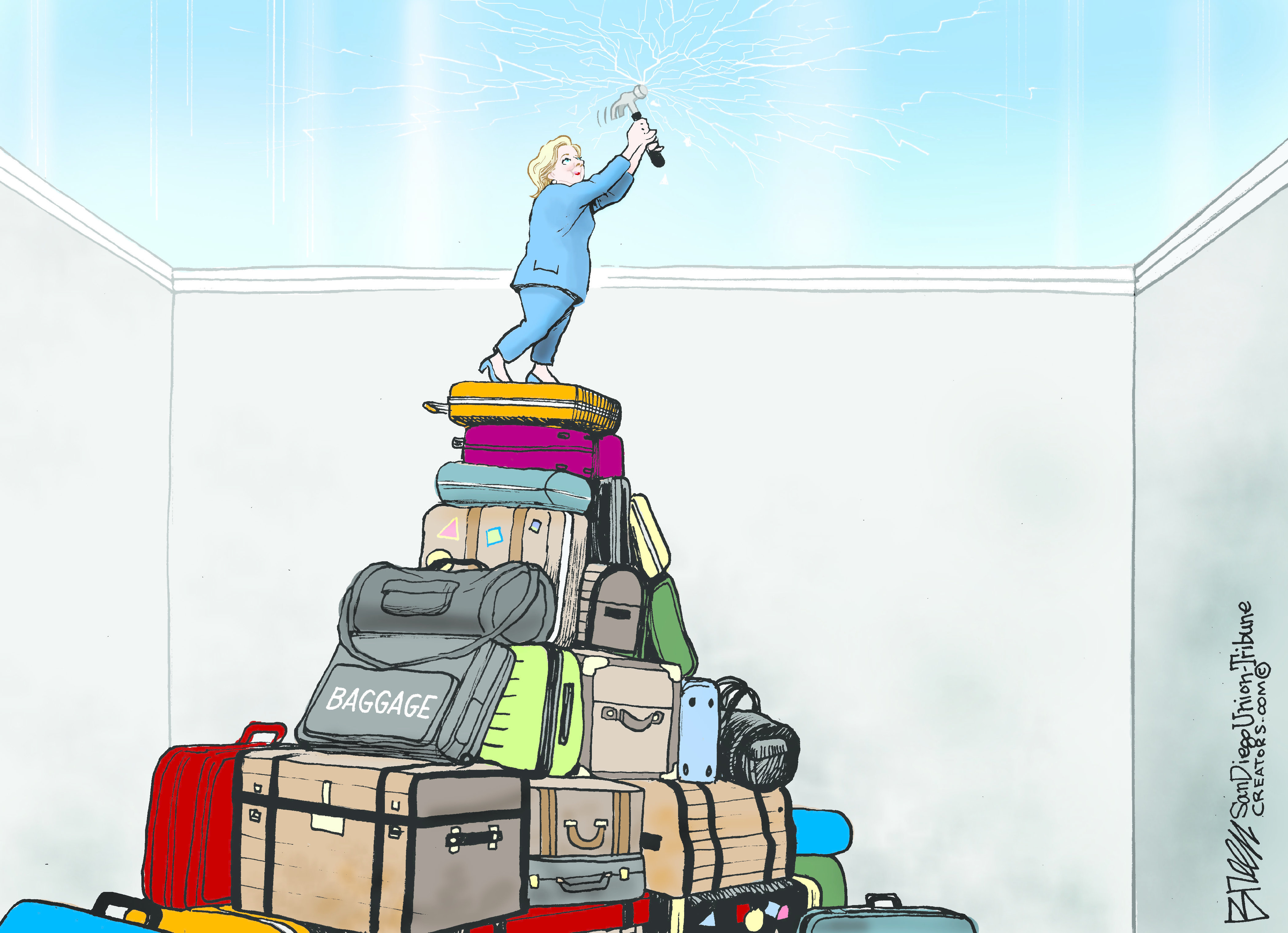 Political cartoon U.S. Hillary Clinton glass ceiling baggage