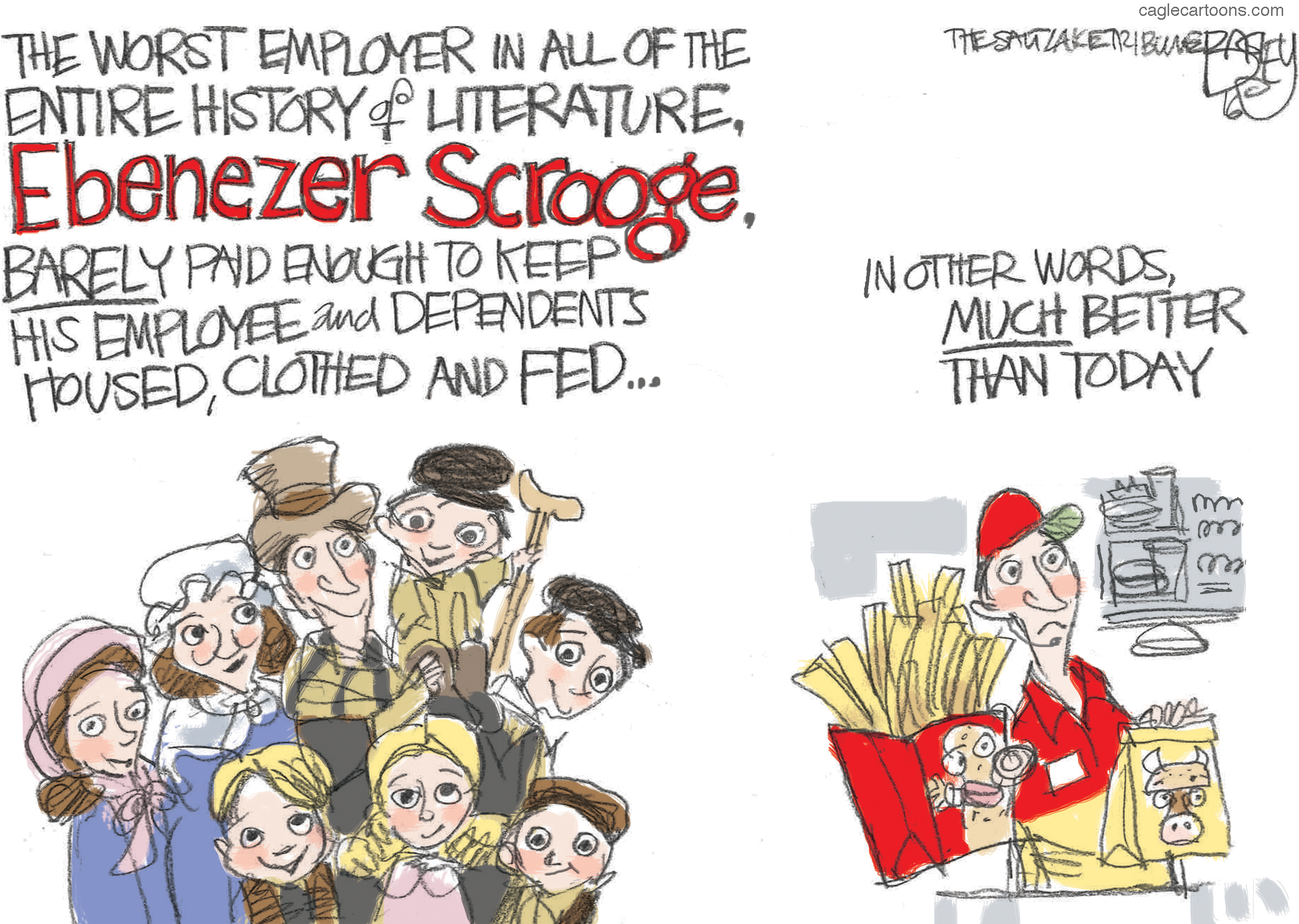 Editorial cartoon U.S. Scrooge fast food worker
