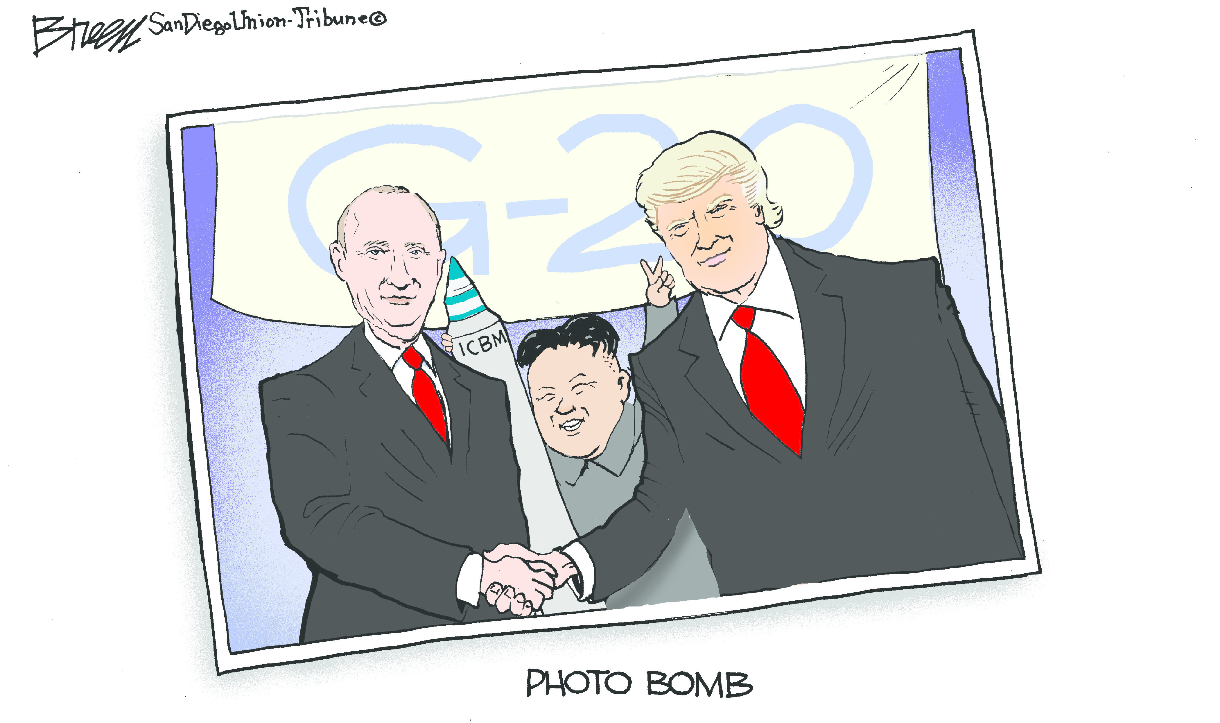 Political cartoon U.S. Trump Putin negotiations Kim Jong Un photo bomb missiles