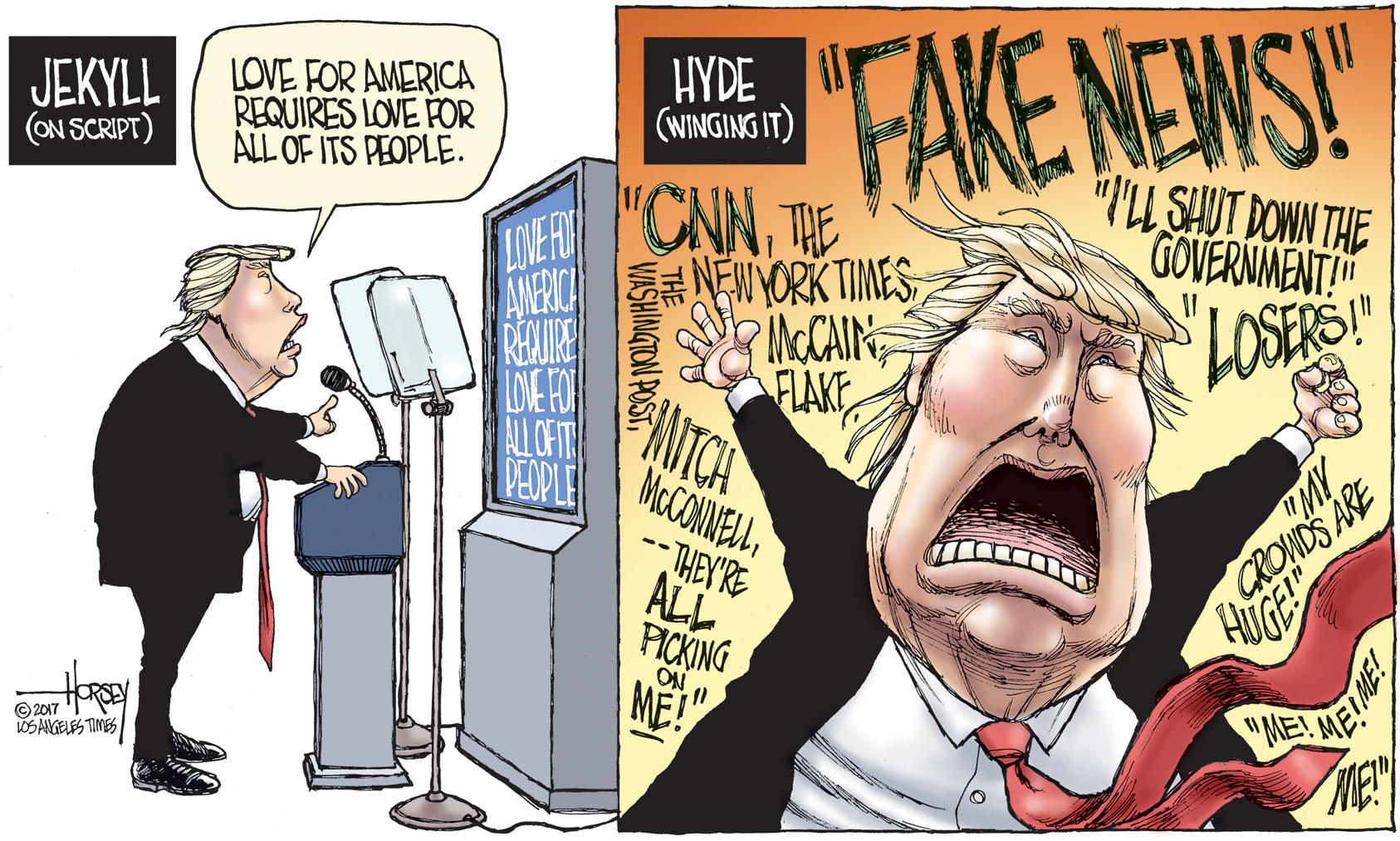 Political cartoon U.S. Trump speech Jekyll and Hyde fake news