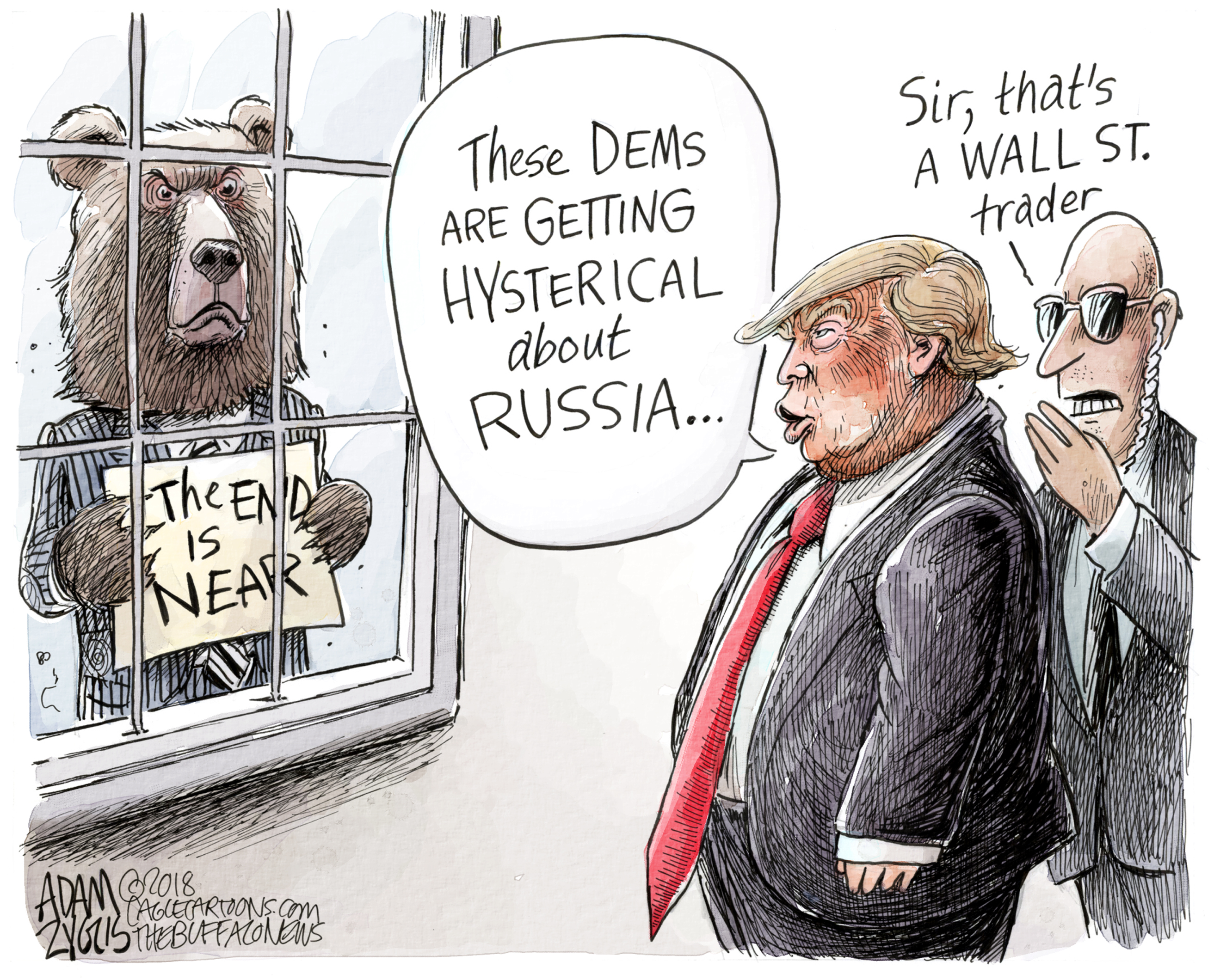 Political cartoon U.S. Trump Russia investigation Dow Jones drop stock market