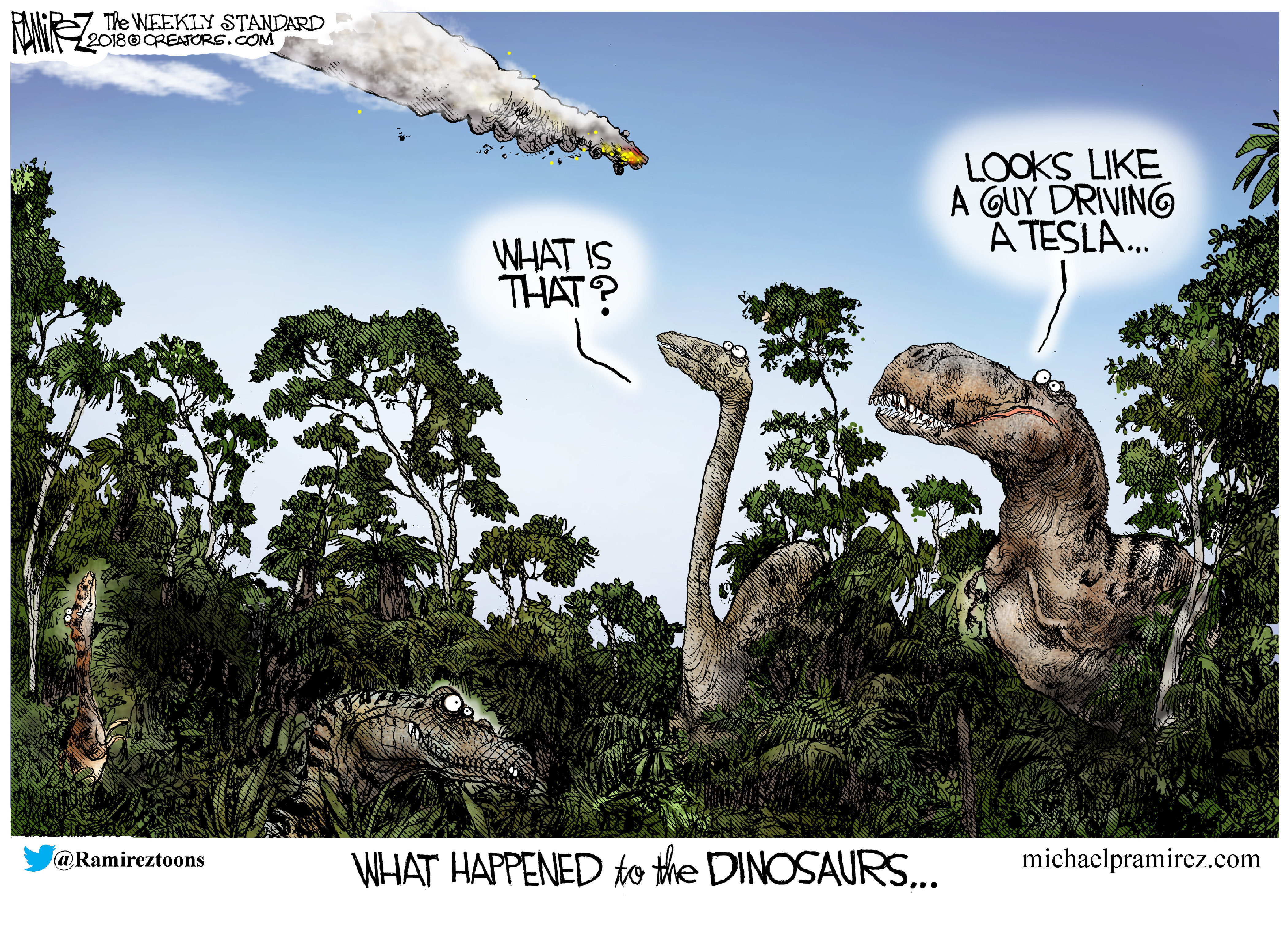 Editorial cartoon U.S. Falcon Heavy Tesla SpaceX dinosaurs