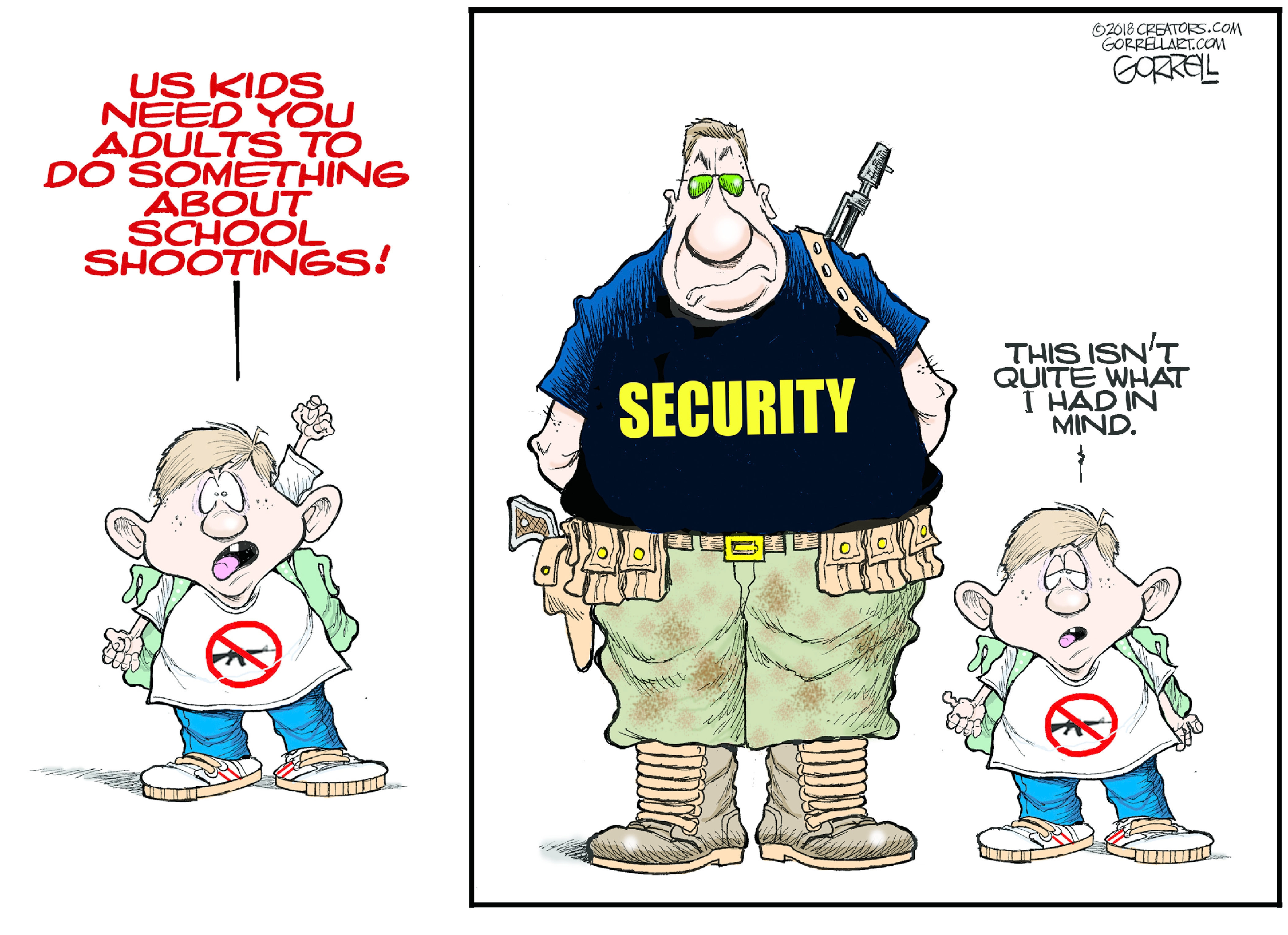 Political cartoon U.S. March For Our Lives Never Again security measures gun control teens