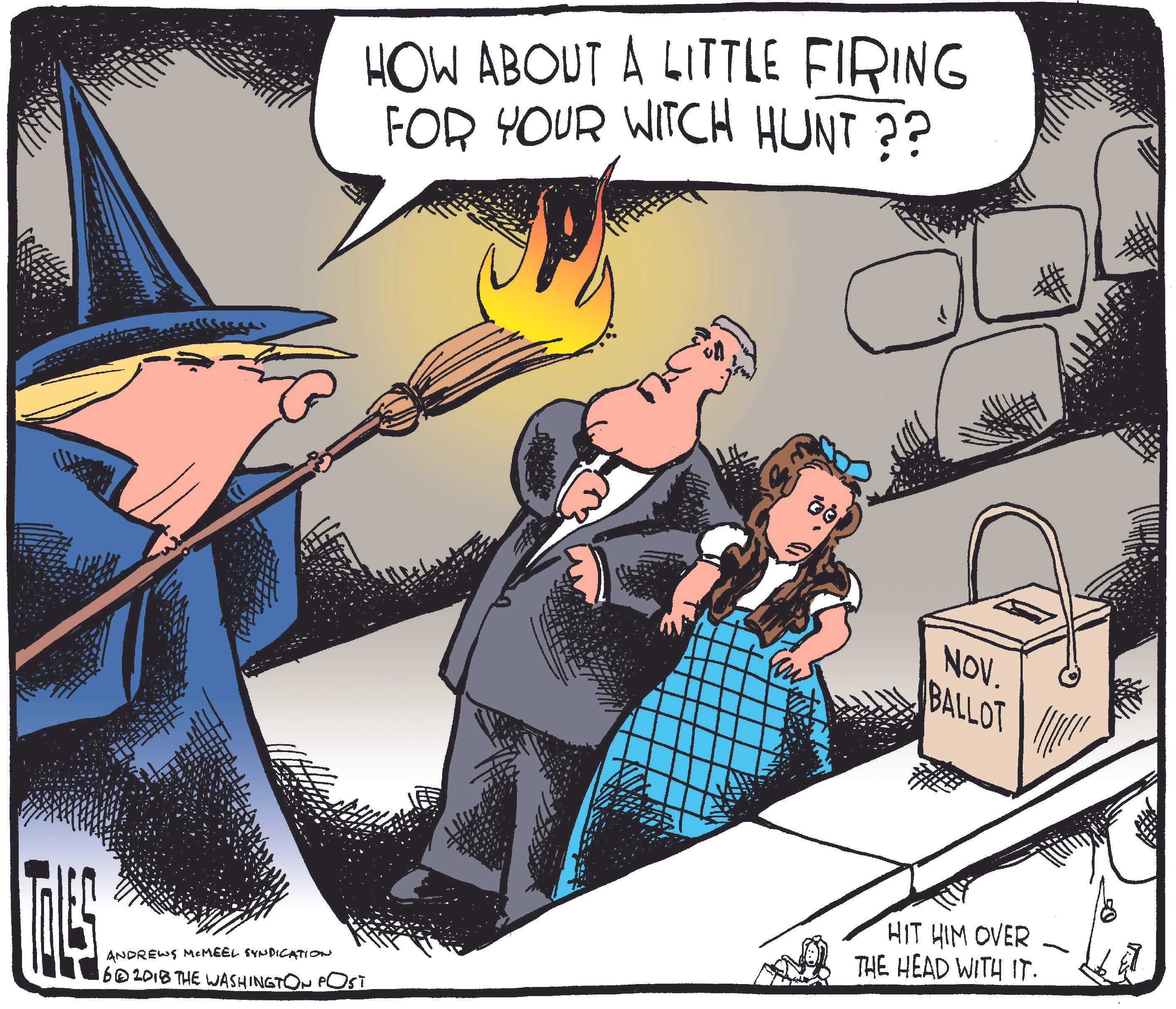 Political cartoon U.S. Trump witch hunt midterm elections Mueller Russia investigation Wizard of Oz