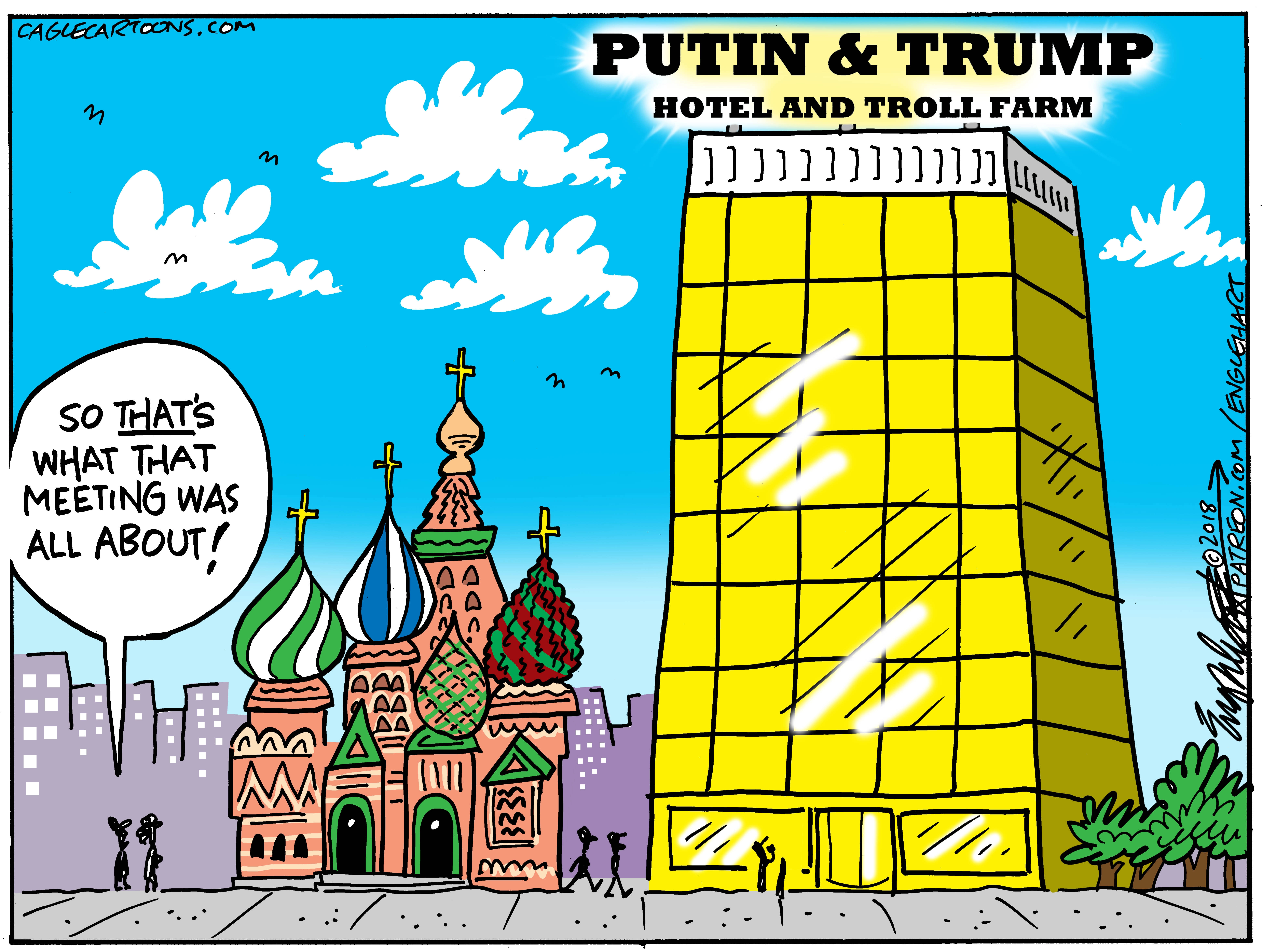 Political cartoon U.S. Trump Putin Helsinki summit Moscow hotel
