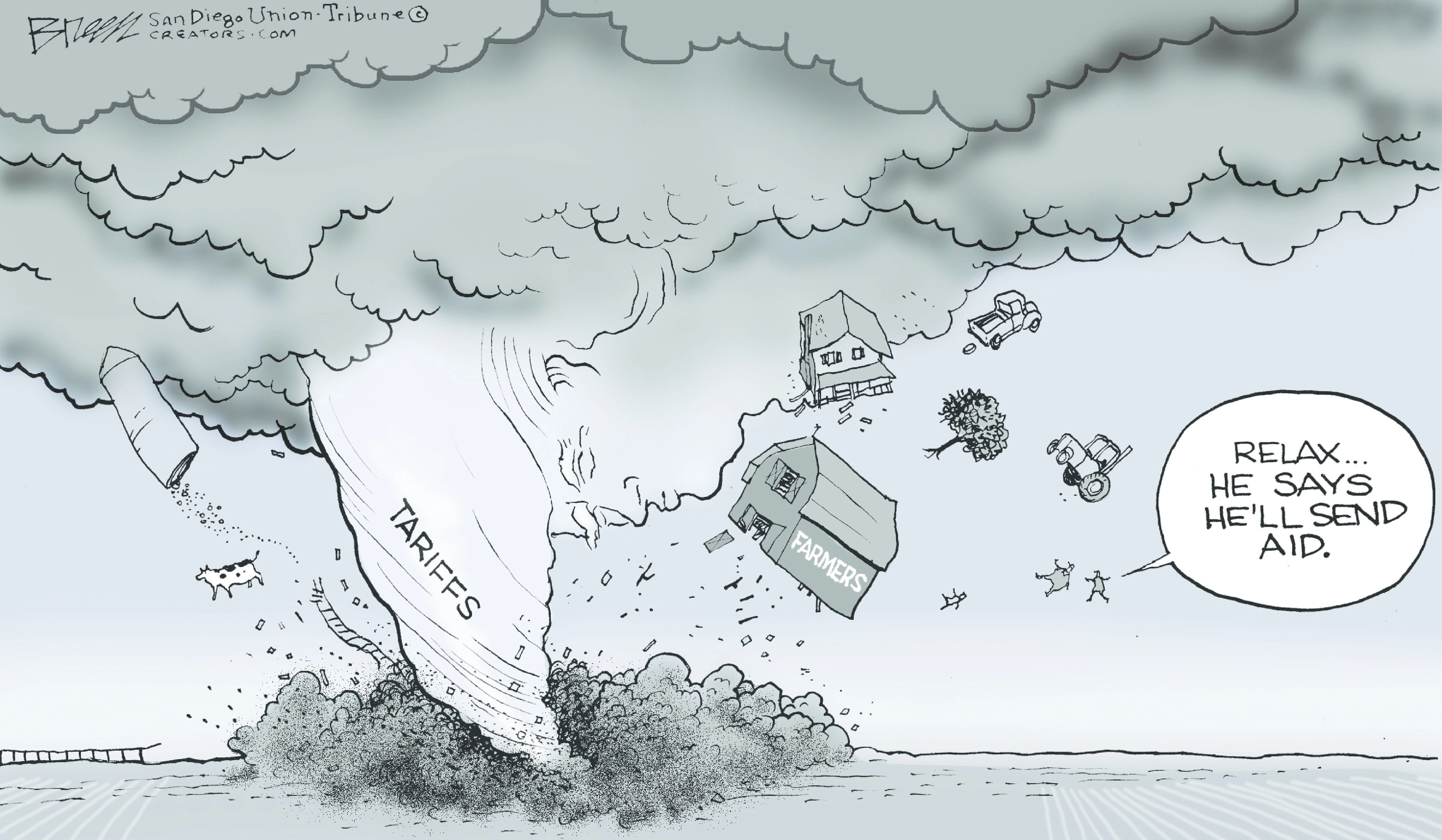 Political cartoon U.S. Trump trade war tariffs farmers aid
