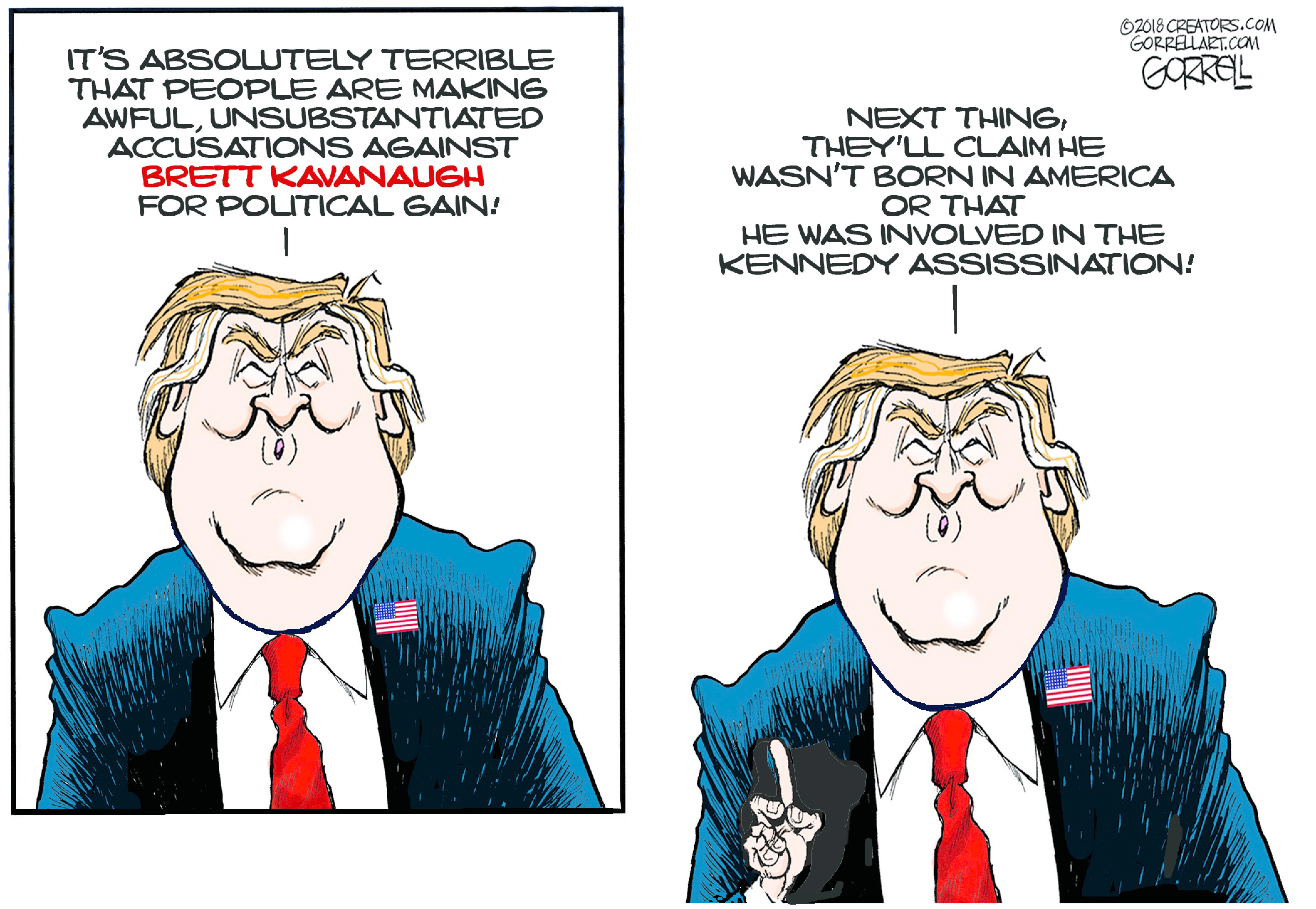 Political cartoon U.S. Trump hypocrite Brett Kavanaugh sexual assault allegations Barack Obama birther conspiracy theory