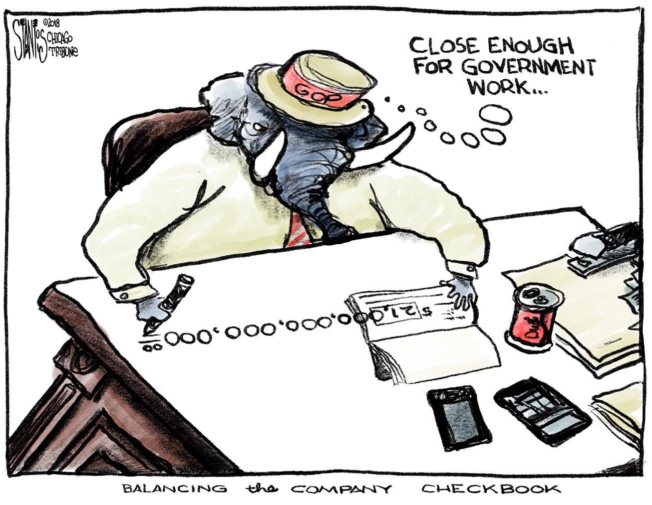 Political cartoon U.S. GOP federal budget deficit balancing the checkbook