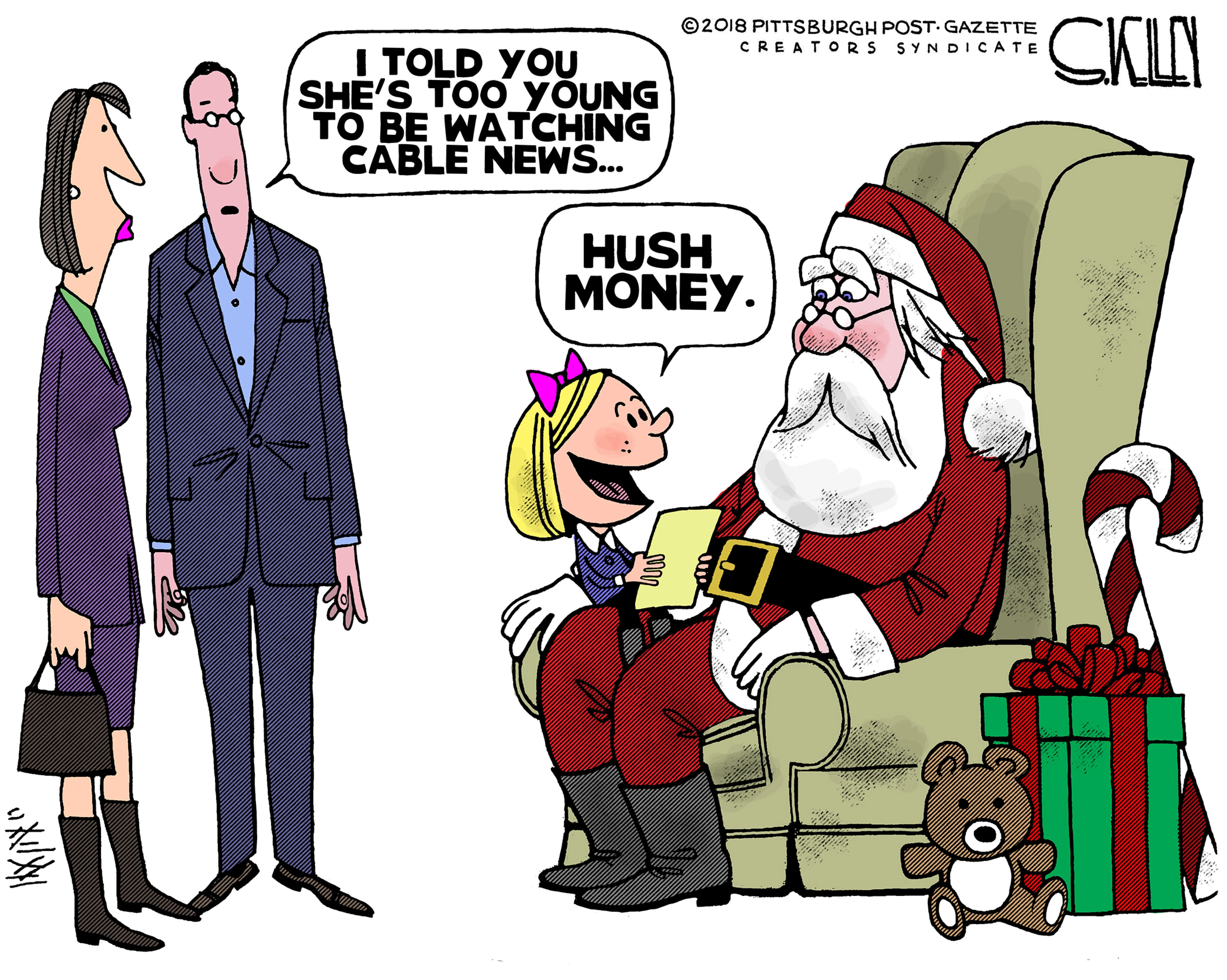 Political cartoon U.S. Santa Christmas wishlist hush money kids cable news Trump