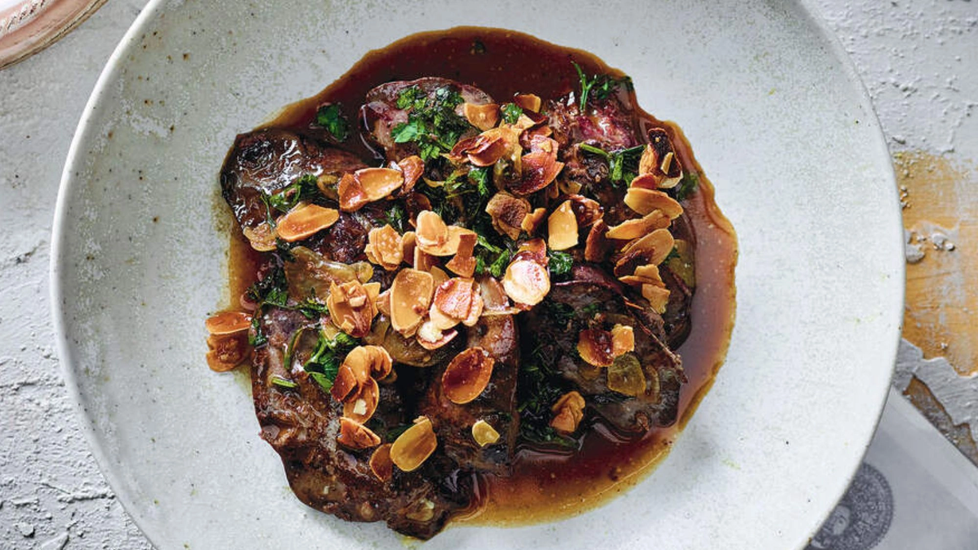- When the livers begin to feel slightly firm – around 4-5 minutes – remove them from the pan and arrange on a serving dish. Cover with the sauce and garnish with the flaked almonds.
