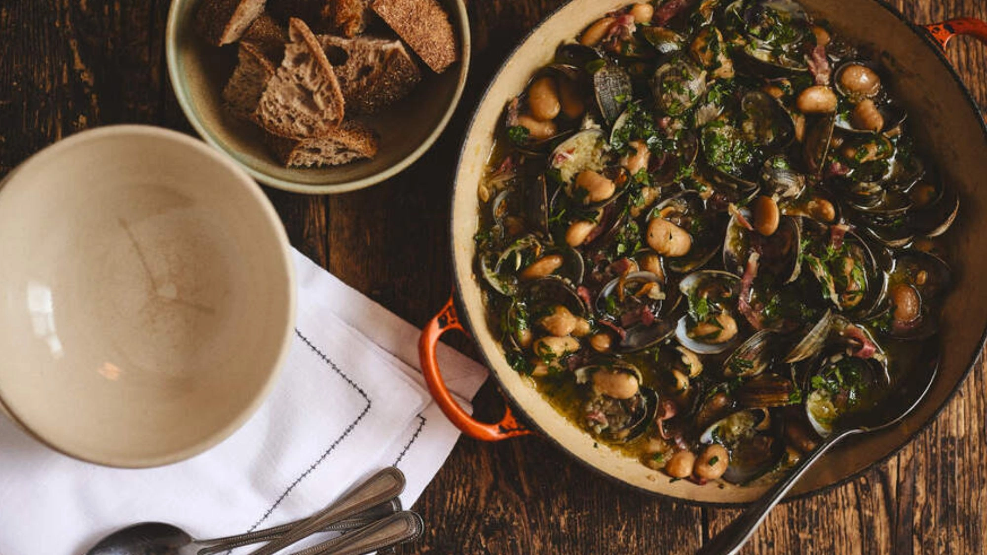 - Serve in the pan that you have cooked it in, in the middle of the table. A few nice chunks of bread served alongside to mop up any juices at the end is a welcome addition.