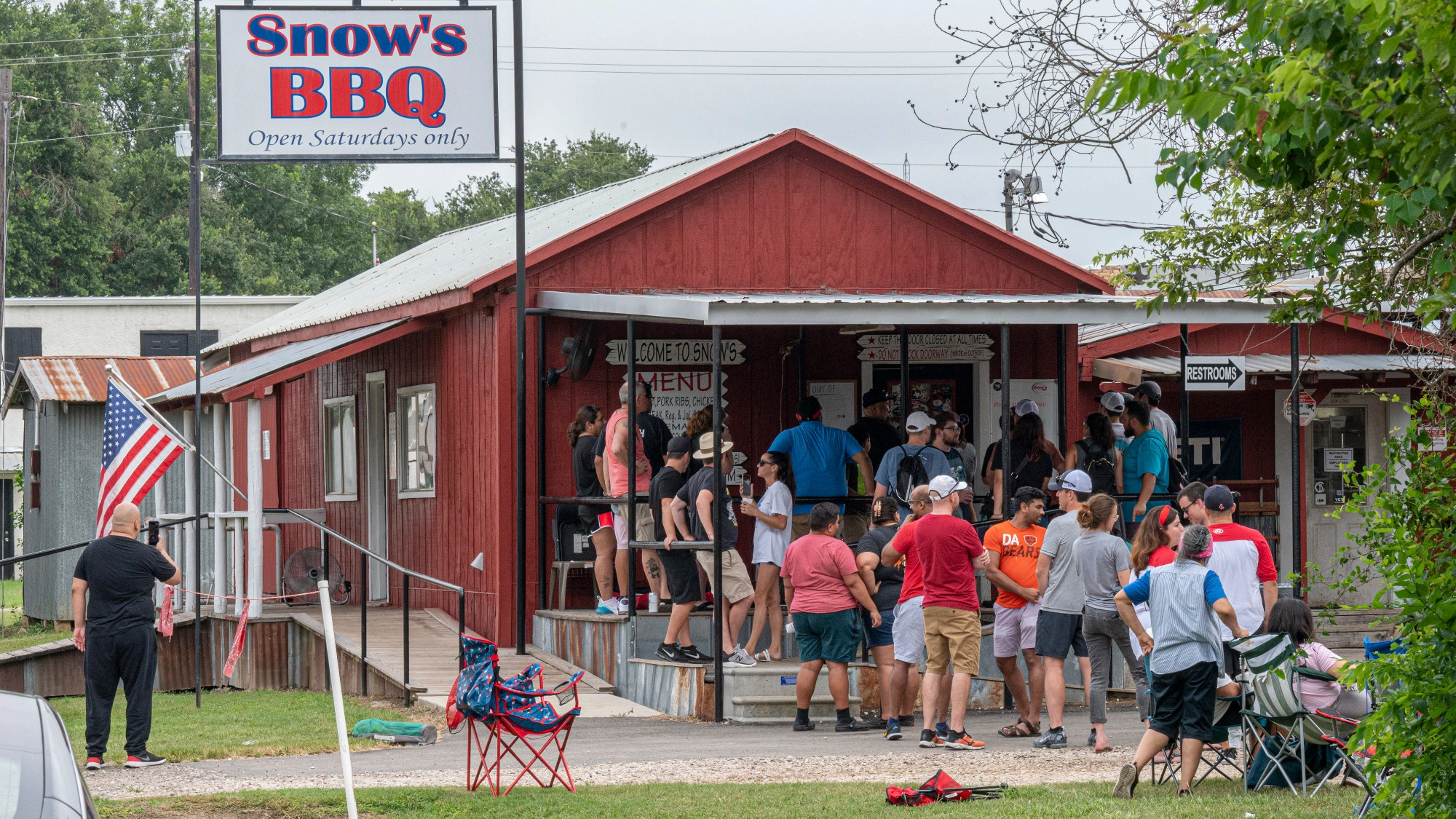 A visit to Snow’s is “an adventure no barbecue fan should miss.” Operating since 2003 and only on Saturdays, it opens at an “egregiously early” 8 a.m., creating hours-long queues. But free beer and Bloody Marys “take the edge off,” and you might glimpse 90-year-old pitmaster Tootsie Tomanetz as you pass the open pit houses. “The payoff comes” when you reach a little red building and load up on brisket, spareribs, and “best of all, tender, juicy pork shoulder steaks with mahogany-hued bark.”