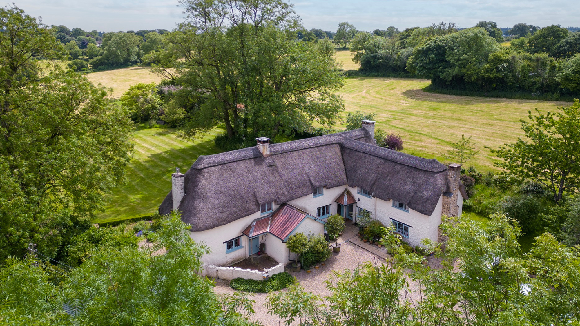 This 17th century thatched farmhouse with 12.69 acres is surrounded by rolling hills and wooded valleys in the heart of the Blackdown Hills. Main suite, 3 further beds, family bath, kitchen/dining room, 2 receps, garden, outbuildings. £1.2m; Stags