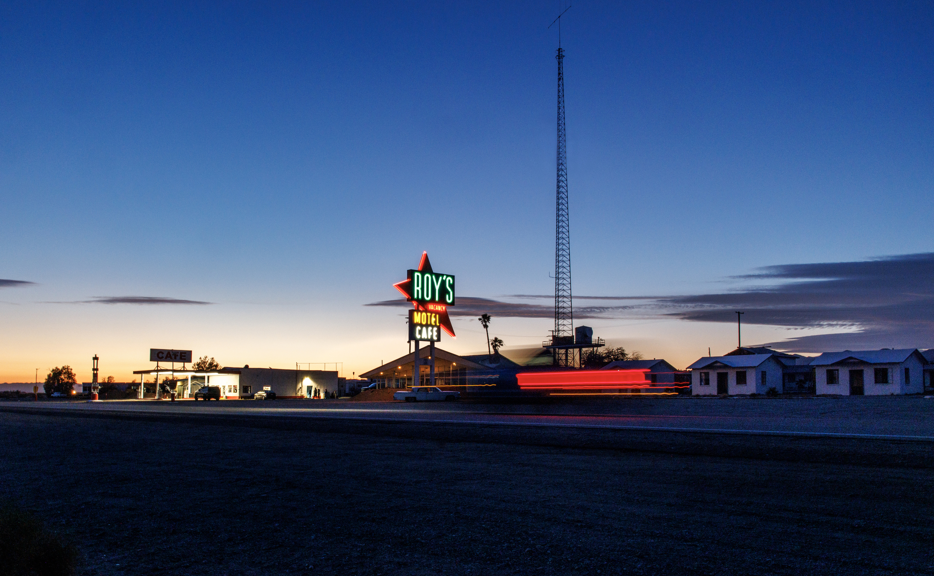 At night, the neon Roy's sign stands out in this empty stretch of desert