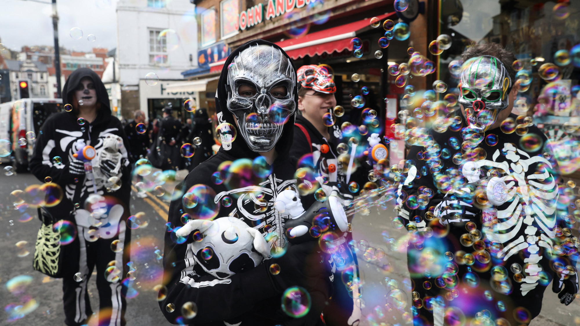 People in skeletal costumes roam the streets during the start of Goth Weekend in the U.K. town of Whitby. The alternative music festival, which began in 1994, is held twice a year to celebrate goth culture.