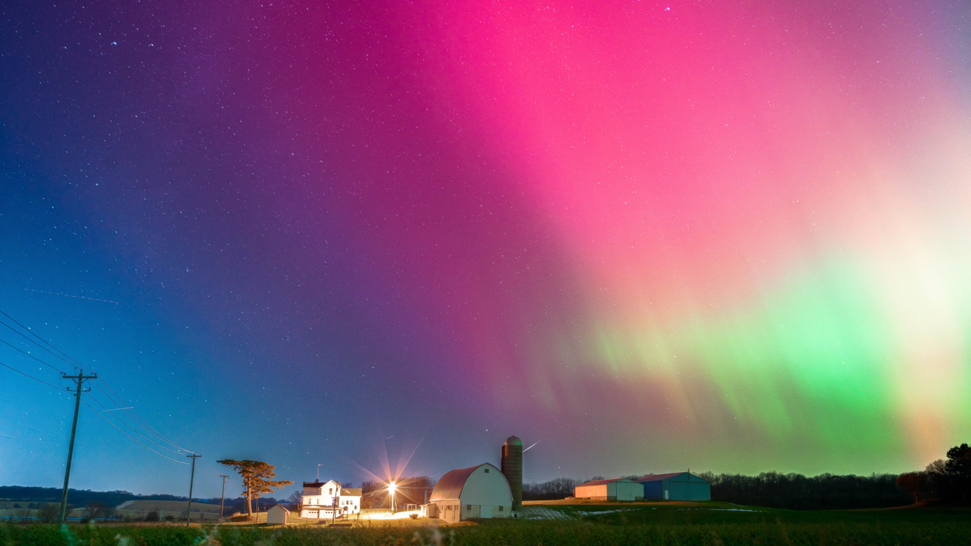 The aurora borealis lights up the sky over Monroe, Wisconsin, during one of the strongest solar storms in decades last night. The geomagnetic event pushed the northern lights deep into the continental U.S., appearing as far south as Alabama.