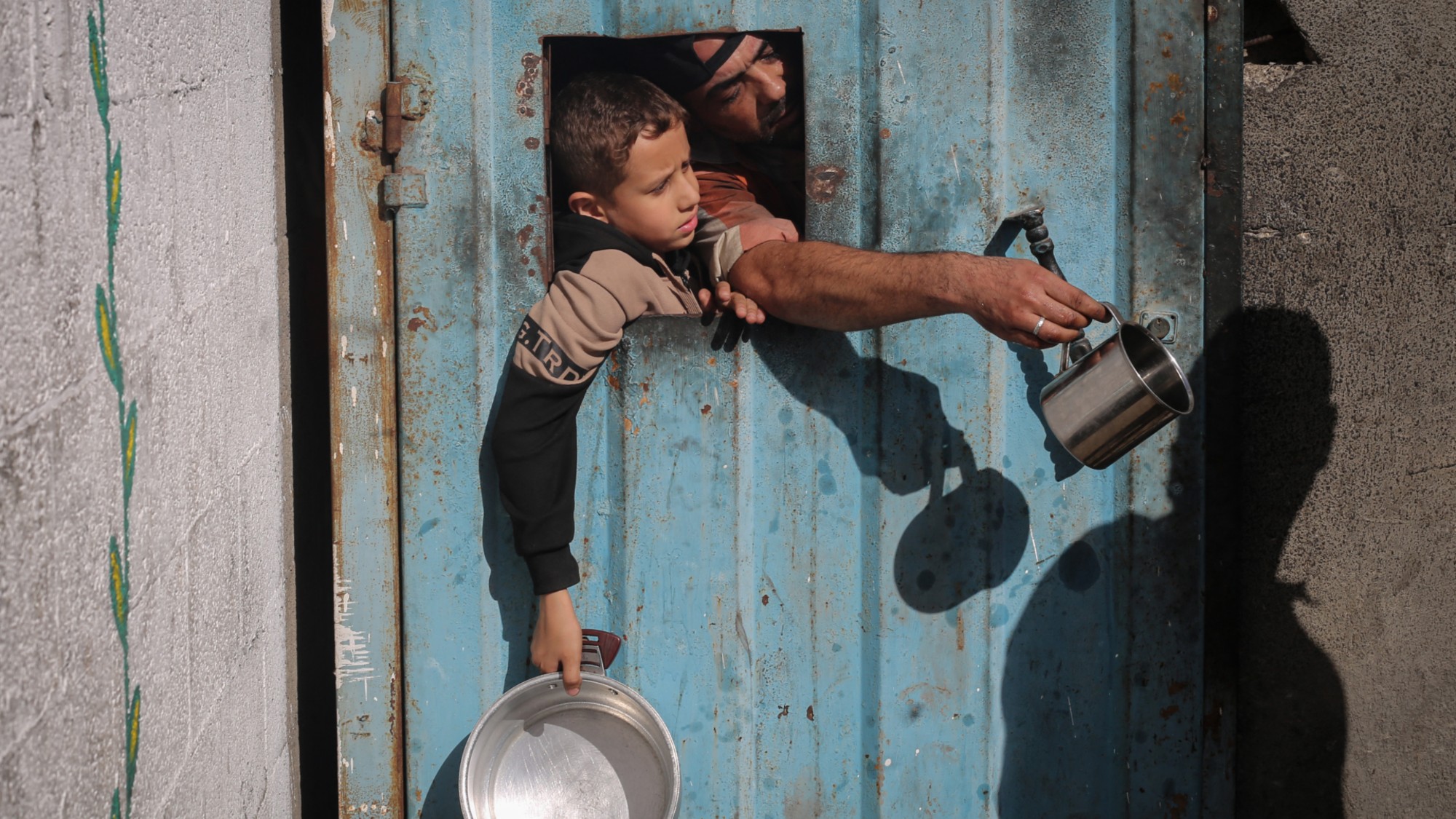 Displaced Palestinians wait for a food portion at Nuseirat refugee camp in Gaza. Aid deliveries into Gaza are “still being held back by restrictions affecting visas and import approvals, too few crossing points” and other impediments, said the U.N. humanitarian agency OCHA.