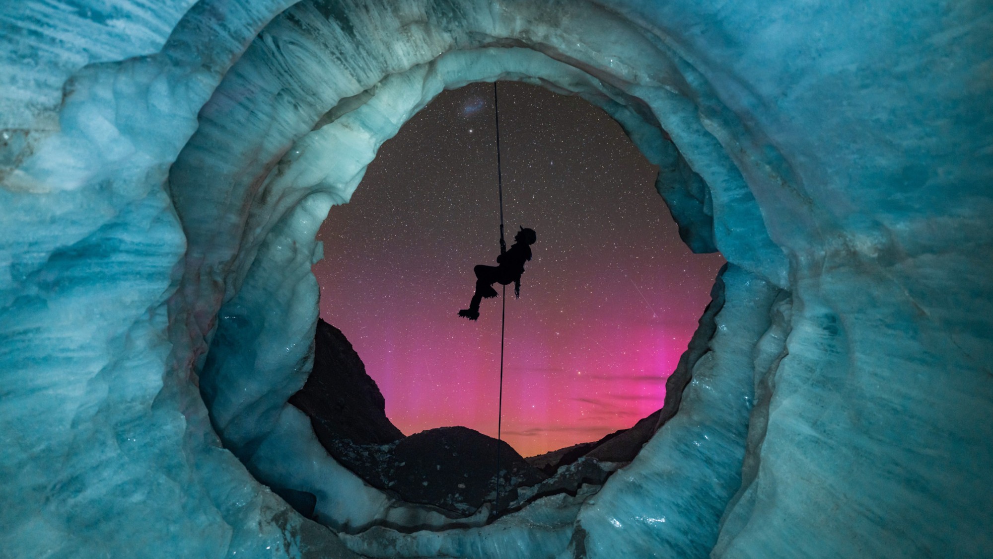An abseiler descends at the opening of an ice cave in New Zealand’s Aoraki / Mount Cook National Park. The image, captured by Tori Harp, is among the 25 winners of the 2025 Northern Lights Photographer of the Year competition, published on the Capture the Atlas blog.