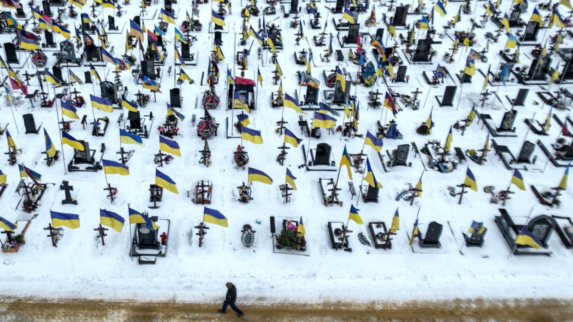 A person walks past the graves of thousands of fallen Ukrainian military personnel at 18 Cemetery in Kharkiv, Ukraine. Today marks four years since Russia launched its full-scale invasion of Ukraine in 2022. More than 55,000 Ukrainian soldiers have been killed, according to Ukrainian President Volodymyr Zelenskyy.