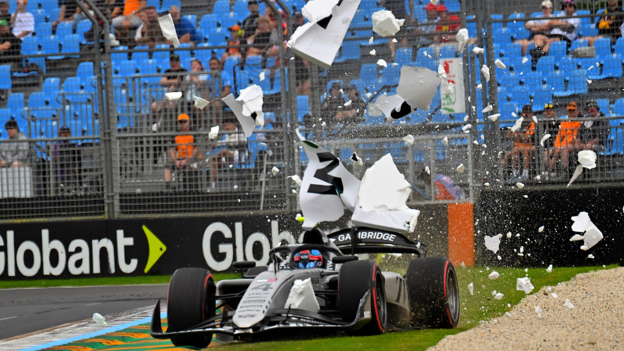 F2 driver Colton Herta crashes out of his debut practice session at the Albert Park Circuit in Melbourne, Australia. The former IndyCar star lost the rear of his Hitech F2 car but emerged from the crash unscathed to applause from fans.